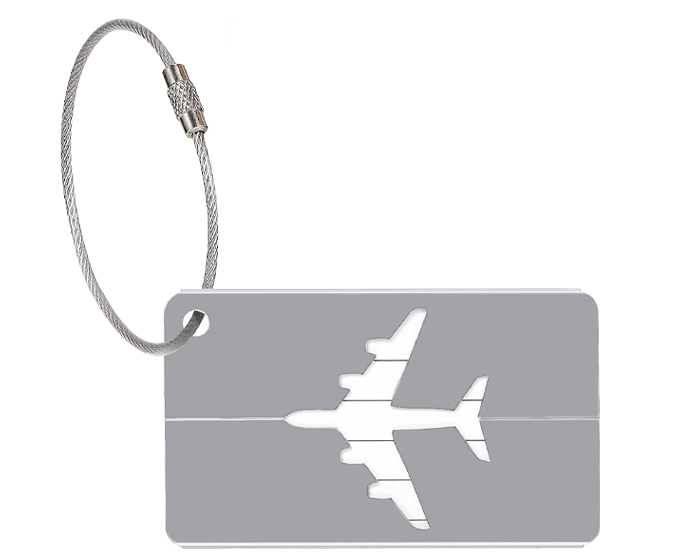 Identificador de equipaje de aluminio con detalle de avión. Cuenta con una pulsera con seguro giratorio hecho de alambre galvanizado recubierto de PVC y una tarjeta para datos personales (español/inglés) con mica protectora.